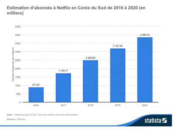 Ayant voulu saisir l’élan de la vague coréenne, Netflix a commencé à ajouter des dramatiques et des téléromans sud-coréens à son catalogue au début de 2017 [32]. Entre-temps, de nouvelles dramatiques coréennes se sont attirées des admirateurs aussi loin qu’au Moyen-Orient et dans certaines régions de l’Afrique [33].