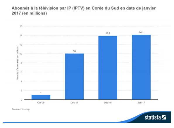 La Corée du Sud fait figure de pionnière dans la diffusion de programmation télévisée par Internet. Au début de 2017, la Corée du Sud comptait un total de 14,1 millions d’utilisateurs d’IPTV abonnés aux opérateurs de lignes fixes suivants: KT Corp., SK Broadband Co. et LG Uplus Corp.
