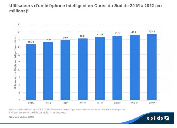 36. Via Statista, « Number of smartphone users in South Korea from 2015 to 2022 (in millions) »